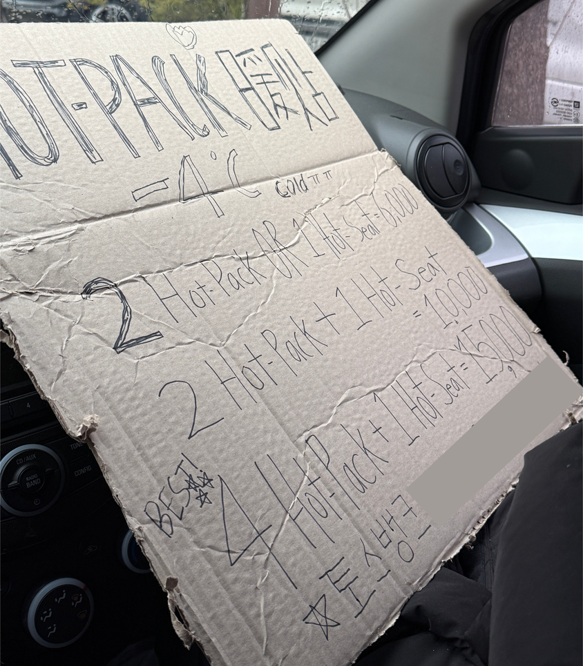 손님들의 반응을 봐가며 가격표를 두 번 바꿨다. 재고도 두 번이나 채웠다. 그리고 그 재고마저 다 떨어졌을 때 장사를 마무리했다. 장사를 시작한 지는 네 시간 정도, 쿠팡으로 핫팩을 주문한 지는 꼬박 하루 정도 지난 시점이었다. 차에 재고도 많았고 유동 인구도 점점 늘어나고 있었지만, 다음 일정과 체력을 생각했다. 결정적으로, 이미 충분히 많이 팔았다.