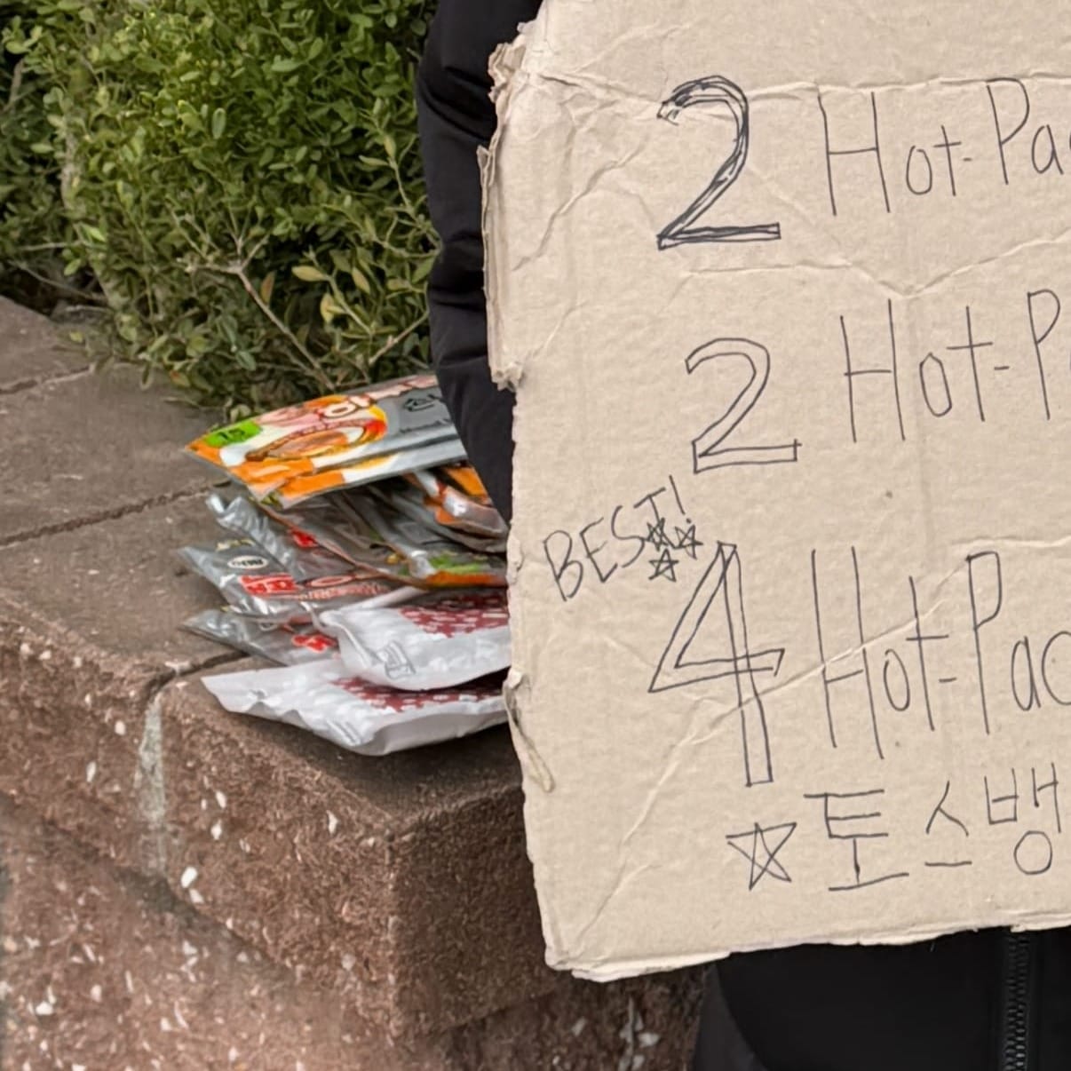 재고가 떨어졌을 땐 걸어서 15분 걸리는 주차장까지 왕복 20분 만에 주파했다. 심지어 핫팩을 캐리어와 쇼핑백에 가득 욱여넣고. 영어를 하지 못하는 중국인들에게는 손짓 발짓을 써가며 방석 핫팩을 설명했고, '누안티에(暖贴, 핫팩)'를 외치며 호객도 했다. 인도에서 '빠니보틀(पानी bottle, 물병)'을 외치며 물을 팔던 친구들처럼, 무미건조한 말투로 "Hot pack, hot seat!"를 외쳤다.