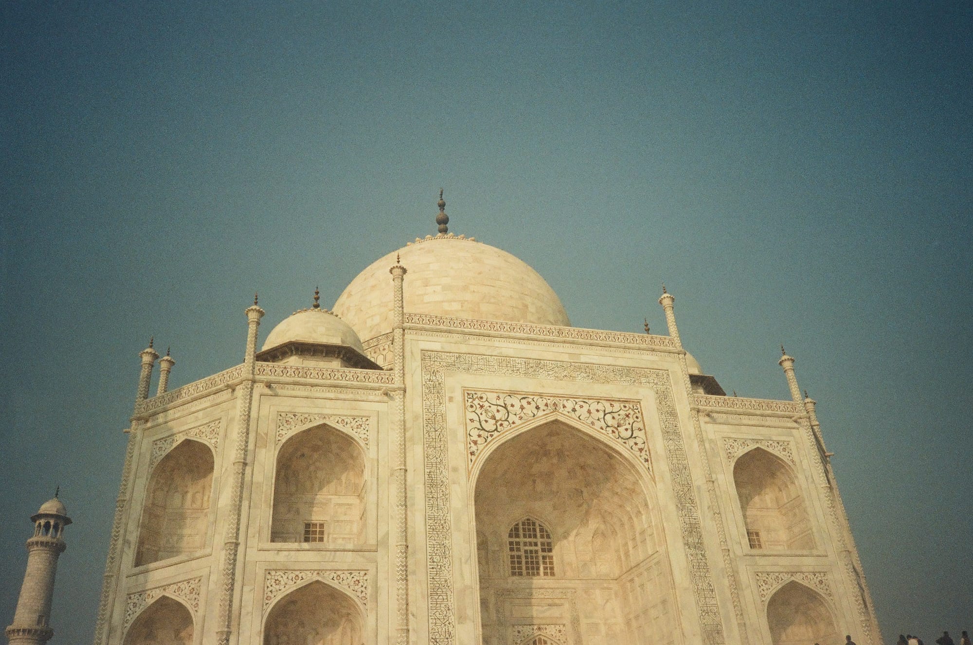 타지마할은 그를 둘러싼 벽 뒤에 숨어있다. 그 모습을 쉬이 보여주지 않는다. 저 멀리 보이는 돔을 향해 걷다 보면 어느샌가 그 자체로 하나의 거대한 액자가 되어 주는 정문 앞에 도착하게 되는데, 액자 안에 담긴 백색의 건물과 파란 하늘은 마치 문 뒤에 다른 세상이 기다리고 있는 것 같은 느낌을 준다.